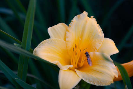 A yellow daylily flower, latin name Hemerocallis lilioasphodelus, at sunset with water drops after rain. It is also known as lemon daylily, lemon lily, yellow daylily