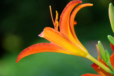 Beauty orange garden lily close up on a green blurred background.