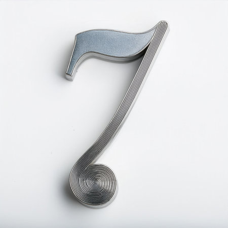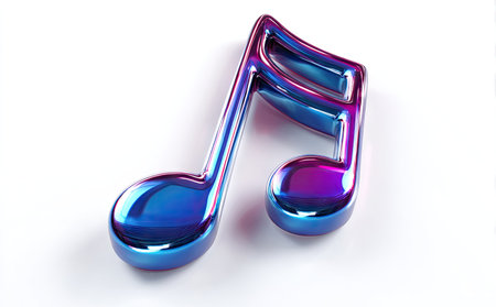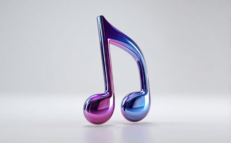 A close-up view presents a rendered metallic music note. The object features a smooth, reflective surface with a gradient of blue and purple hues. The composition suggests a clean, modern style against a white background, suitable for various design projects and visual content applications.