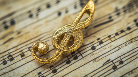 This stunning image features a golden treble clef beautifully positioned on a vintage sheet music backdrop, perfect for inspiring creativity in musical designs.