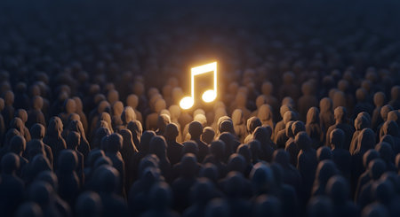 Conceptual image of crowd of people with glowing music note sign. 3D rendering