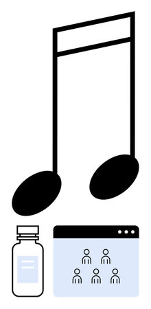 Large musical note over a medicine bottle and video conference screen with avatars. Ideal for music therapy, online collaboration, digital health, creativity, medicine, remote teamwork, abstract line