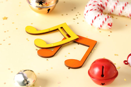 Note signs and Christmas bells on color background