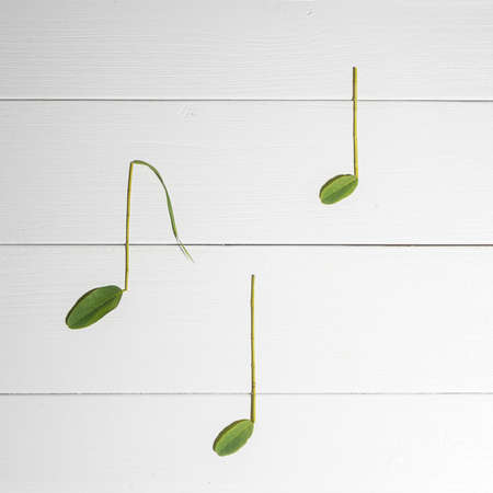 Dandelions and green grass like musical notes on a white background. Flat lay abstract minimal spring concept