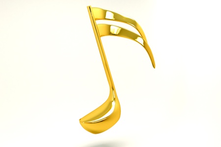 Shiny gold eighth note symbol with smooth curves and reflective surface, standing on a plain white background with subtle shadowing, representing music and harmony.