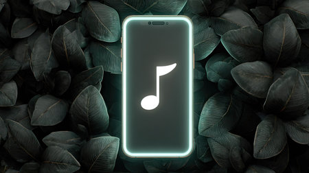 An illuminated smartphone displays a music note icon, centrally positioned against a backdrop of dark green leaves. The composition highlights a modern technology concept, with a minimalist, clean aesthetic. The lighting suggests an artistic or digitally generated visual suitable for promotional media and editorial design.