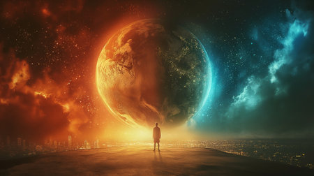 Two figures stand before a split Earth, displaying contrasting colors and elements in a dramatic scene.
