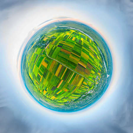 blue sky ball among green grass. Inversion of tiny planet transformation of spherical panorama 360 degrees. Spherical abstract view. Curvature of space.