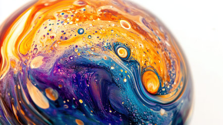 Vibrant, swirling orb with textured surface and color gradients against a light blue background