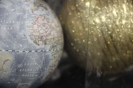 A shallow focus shot of two 3D globe model with a blurred ocean in the background