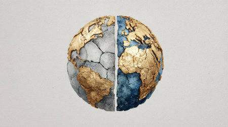 A globe divided in two shows gold textures on one side and a rugged gray surface on the other, highlighting contrasts.