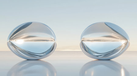 Two modern abstract sculptures display shiny surfaces and smooth shapes, reflecting light beautifully in a tranquil, minimalist setting, ideal for artistic inspiration.