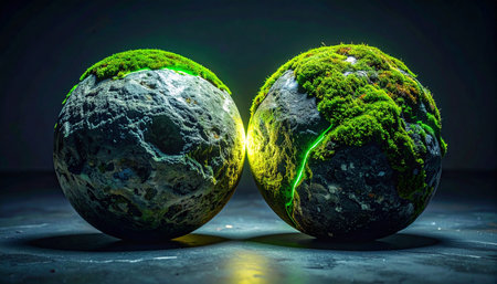 Two worlds collide in a powerful visual metaphor. On one side, a barren, lifeless rock represents a world depleted.