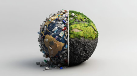 Half earth globe covered by plastic and garbage vs clean green nature, concept of pollution and climate change. Generative AI