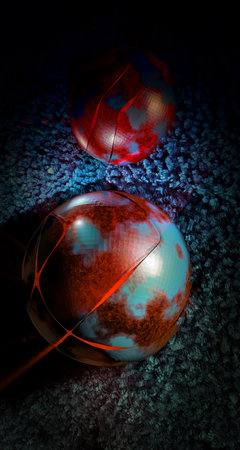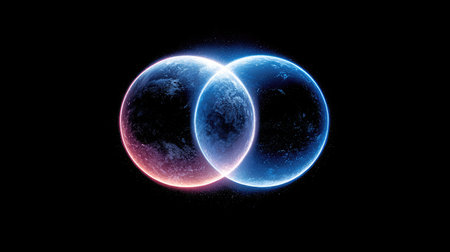 This abstract illustration presents two spheres, one red and one blue, overlapping against a dark backdrop. The spheres feature vibrant, glowing outlines and gradients, creating a dynamic visual effect. The composition utilizes a minimalist style, lending itself to various commercial applications, including graphic design and conceptual projects.