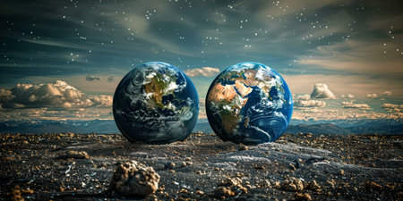 Artistic representation of two Earths, showing the concept of doubling the world's size, with detailed continents and oceans.