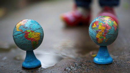 A captivating arrangement of five colorful globe orbs representing various continents, beautifully reflecting on a smooth surface. Ideal for global, travel, and educational themes.