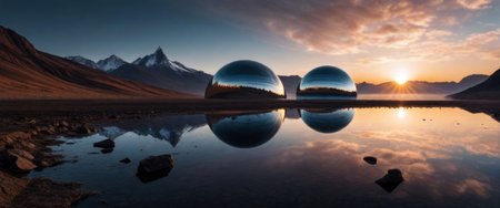 Two glass spheres are reflecting golden light while resting on a wet surface covered in water drops.