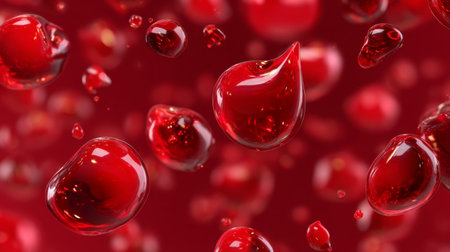 Red blood cells float gracefully, their rich hues illuminated in a swirling dance. The ethereal glow highlights their unique shapes and essential role in life, showcasing natures marvels.