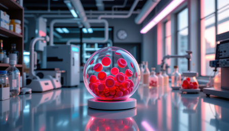 Modern laboratory scene showcasing a glass sphere with red particles, scientific equipment, and workspace illuminated by neon lights, creating a vibrant atmosphere