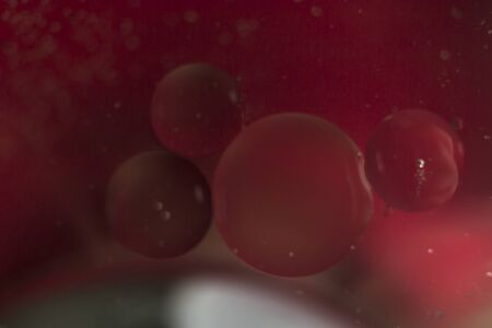 This image showcases vivid red molecules encased in transparent bubbles, reflecting light and creating an eye-catching composition suitable for scientific themes.