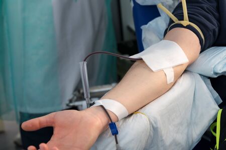 Blood donation in a hospital. Blood transfusion in the hands of a doctor.