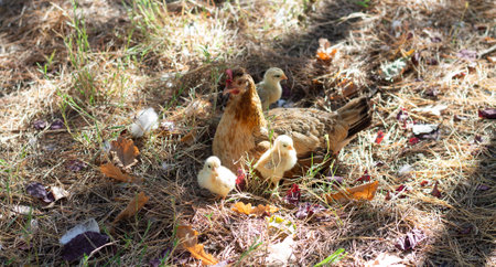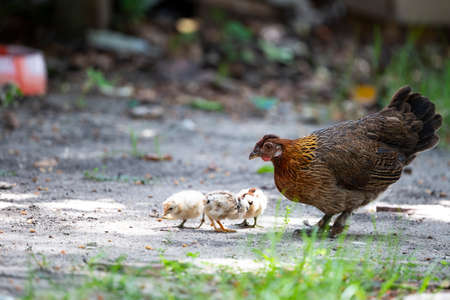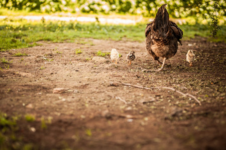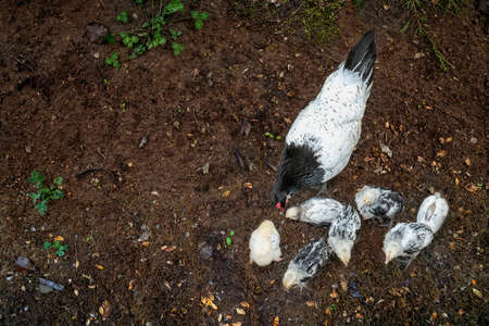 The laying hen took her chicks out for a walk and search for food.