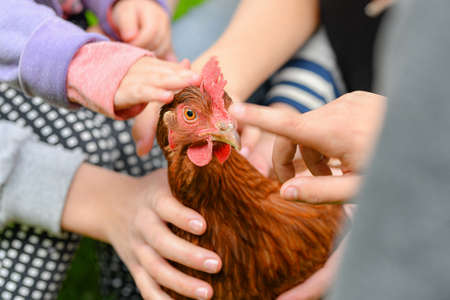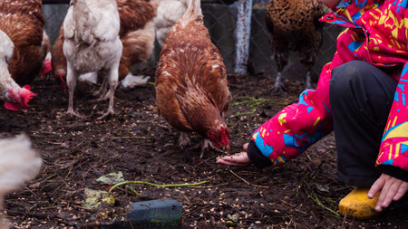 A close-up of a childs hand holding grain from which chickens are eating. A child in a rural yard, hand-feeding grain to chickens in the backyard, is learning about farm life and caring for animals.