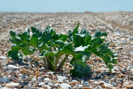 View over sea shells beach with Crambe maritima sea-kale or crambe