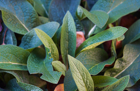 Green background of leaves in dark oblong colors. spring flowerbed. selective focus.