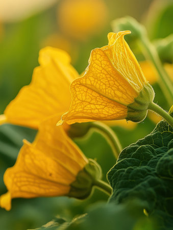 Bright yellow squash flowers bloom among lush green leaves, highlighting the beauty of nature in a morning garden setting.