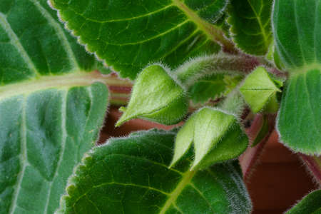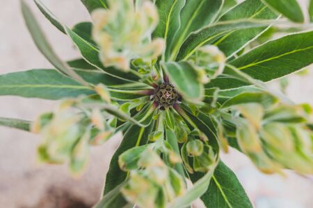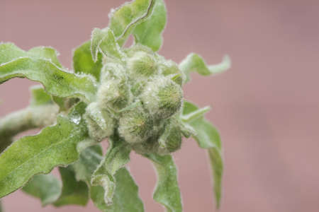 Andryala species Flower heads young green plant with closed buds reddish background light by flash