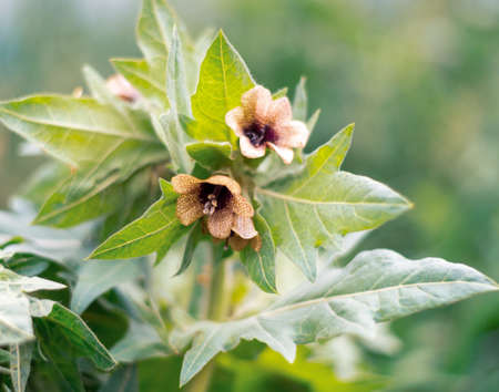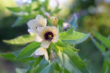 Wild-growing poisonous herb Hyoscyamus. Beige flower with lilac veins and leaves