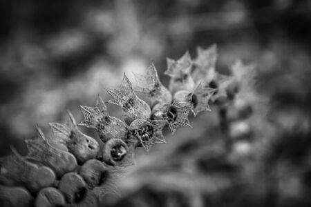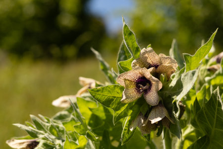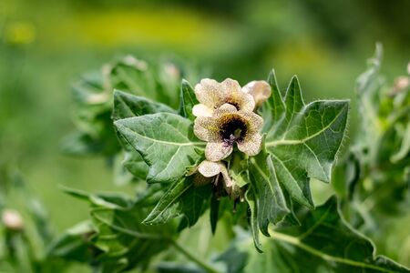 Hyoscyamus niger, black henbane, stinking nightshade poisinous flowers closeup selective focus