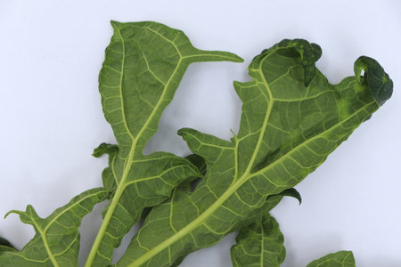 An isolated studio shot exhibits fresh green papaya leaves with distinctive veins details against a clean white background, highlighting texture.