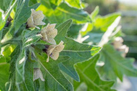 Hyoscyamus niger, commonly known as henbane, black henbane or stinking nightshade, is a plant that is poisonous in the family Solanaceae. Focus on foreground.
