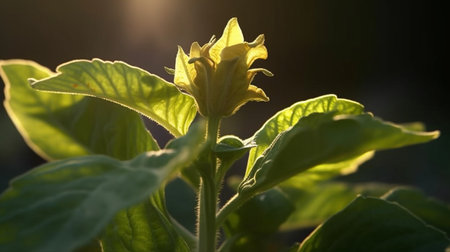 Close-up of a vibrant green plant bud, sunlight illuminating its delicate leaves.