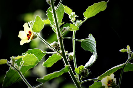 Belladonna medicinal plant, flowers and leaves close-up in backlight. Atropa belladonna is a Latin name. It is used as a painkiller