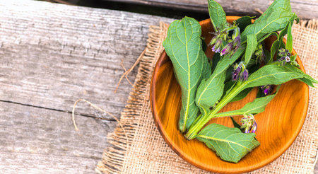 Symphytum officinale, other species of Symphytum, comfrey on meadow. Soft focus