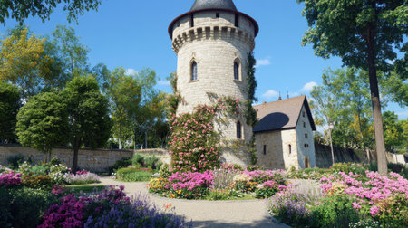 The flower-covered tower of the historic city walls in Strasbourg, Alsace, against a clear blue sky background, photographically detailed portraitures, rustic materiality, colorful floral arrangements, accurate and realistic. --chaos 30 --ar 16:9 --v 6.1 Job ID: f2893662-714e-490e-bc1d-c45f26db2394