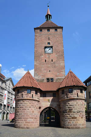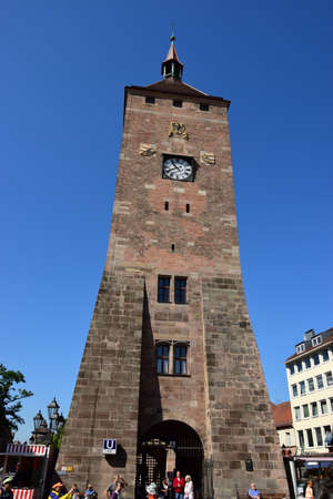 Historic White Tower (Weißer Turm) in Nuremberg, Bavaria, Germany, showcasing medieval architecture, stone details, and a popular landmark in the heart of the city.