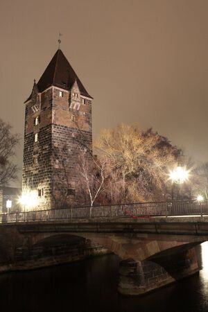 Jail and Pegnitz river in Neurenburg at nighttime.