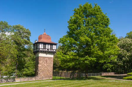 Maulbronn, Germany - April 30, 2018: The historic Faust Tower as part of the former monastery wall of Maulbronn Abbey. Maulbronn Abbey is located in the town of Maulbronn in Kraichgau in Germany, and is a Unesco World Heritage Site