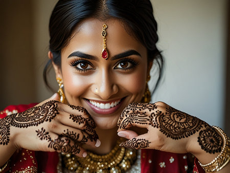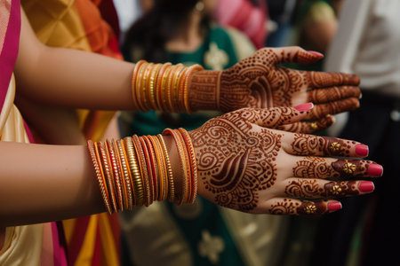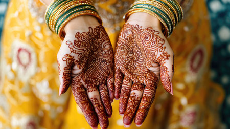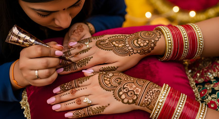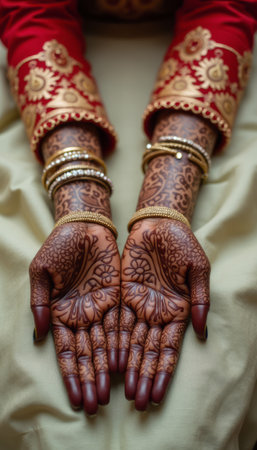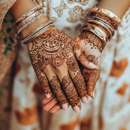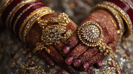 Beautifully adorned hands showcase intricate henna designs and stunning wedding jewelry during a traditional Indian celebration, symbolizing elegance and joy.