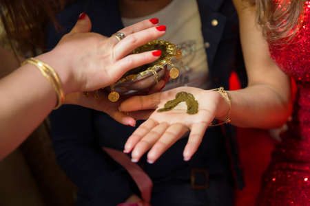 Drawing henna at the Henna party. They put their hands henna of the bride .