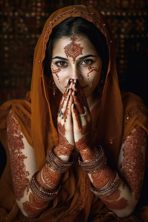 Indian Woman with Henna-Decorated Hands: A close-up of an Indian woman's hands decorated with intricate henna patterns, emphasizing the beauty and artistry of Indian culture.