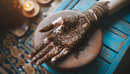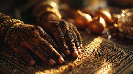 Hands decorated with intricate henna designs are placed on a beautifully patterned surface, surrounded by decorative items, creating a warm and inviting atmosphere, AI generated