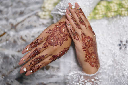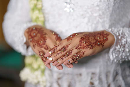 henna art on the bride's hand for wedding decoration. hands holding jasmine garlands. the concept of a traditional Javanese wedding, Indonesia