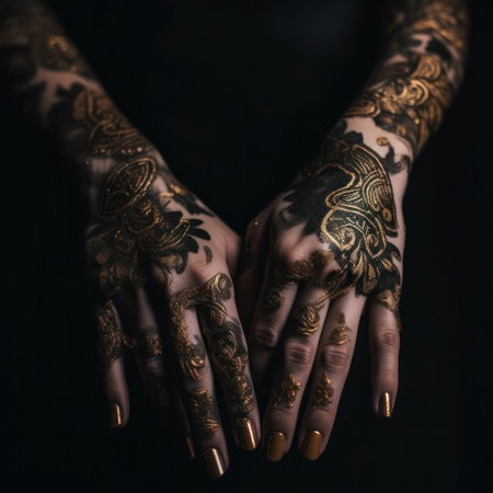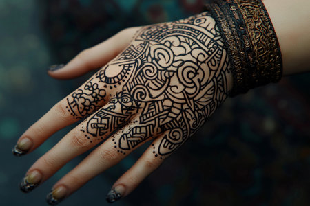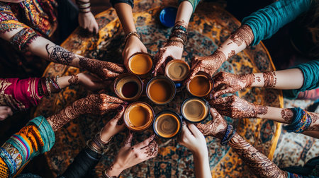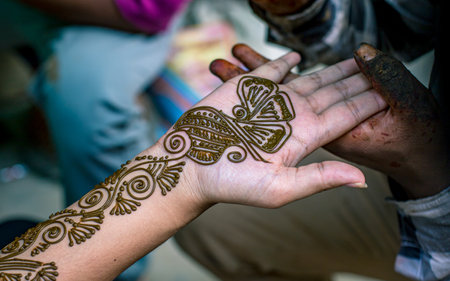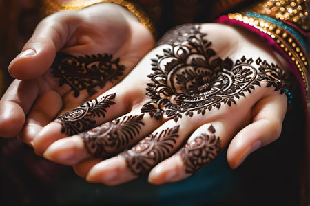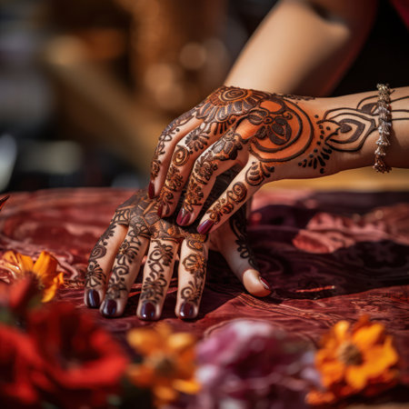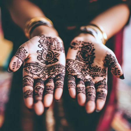 Beautiful patterns created with henna cover the hands, showcasing artistry and tradition. This vibrant display occurs during a festive gathering, emphasizing cultural heritage and creativity.