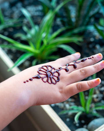 Picture of human hand being decorated with henna Tattoo. mehendi hand